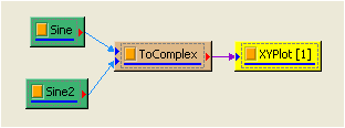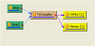 若要繪製訊號在複數平面上的圖形,可利用 XYPLot。在 ToMulti 後方接上 Viewer / XY Plot Viewer,此 Viewer 會將輸入訊號實部資料當作 X 值,虛部資料當作 Y 值,依時間順序繪圖。本例所產生的複數是