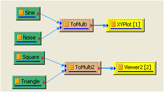 於 Network視窗下選擇 Source / Noise 創造一個白色雜訊和 Source / Sine Wave,Properties 為預設,最後以 Compute / Coversion / Merge to Multi-channel 將上述訊號合成兩個通道的訊號,再利用 Source / Square 創造方波和 Source / Triangle Wave 三角波,設定 Properties / TimeLength 設定為 2 秒,最後以 Compute / Coversion / Merge to Multi-channel 將上述訊號合成二維資料 ReferenceInput 皆以預設值 0,用 Viewer / Channel Viewer 顯示於視窗。