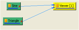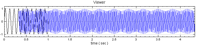 以 Source / Sine Wave 產生 一組正弦波訊號,再用 Source / Triangle 產生一組三角波訊號,改變 Triangle的 Properties / SamplingFreq 為 333,TimeStart 為 0.33,TimeLength 設為 4秒,最後將兩筆訊號連入同一個 Viewer / Channel Viewer 繪圖。