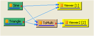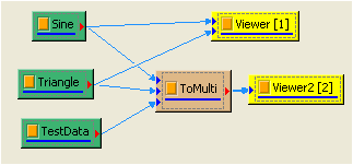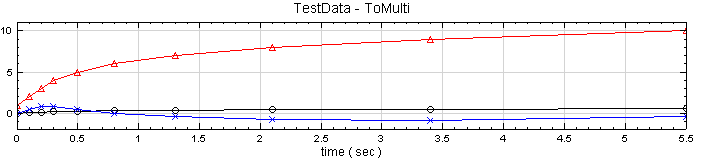 ToMulti 不僅可允許regular、Indexed 的輸入訊號格式,若輸入訊號有 regular 與Indexed,一樣可以處理。把 TestData 拉入 ToMulti中,Properties / ReferenceInput 設為 2:TestData,則原本時間軸格式為 regular 的訊號 Sine 與 Triangle,其時間訊會被換成 TestData 的時間軸,觀察 Channel Viewer 的結果會更清楚。