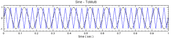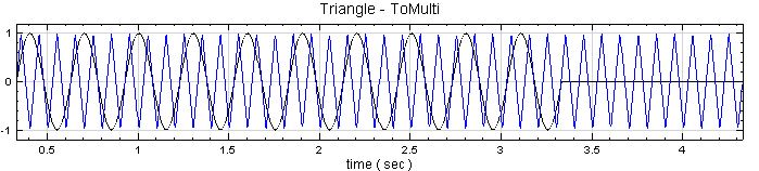 點選 ToMulti,由於它的 Properties / ReferenceInput 設定為 Sine,因此輸出檔的時間軸資訊與 Sine Wave相同,即時間起始點為 0,取樣頻率為 1000 Hz,時間長度為 1 秒,資料點數有 1001個。資料內容方面 Sine 會被完整複製到 ToMulti 的CH1 中。而就 Triangle 而言,時間軸資訊將被取代,且因為 ReferenceInput 的資料點數為 1001,而 Triangle 有 1333 個點,本模組會將 Triangle 的前 1001 個資料放入輸出訊號的 CH2 中,並刪除剩下的資料點。
