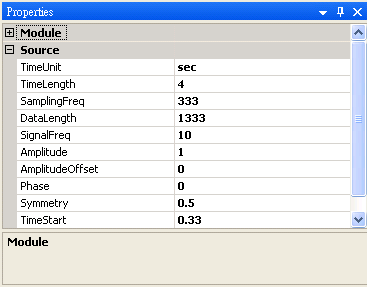 若調整 Properties / ReferenceInput 為 1:Triangle,則輸出檔的時間軸資訊與 Triangle 相同。由於 Triangle 有 1333個點,而Sine3 點數有 1001 個,因此輸出訊號的 CH1 會在 Sine 沒有資料的地方補 0。