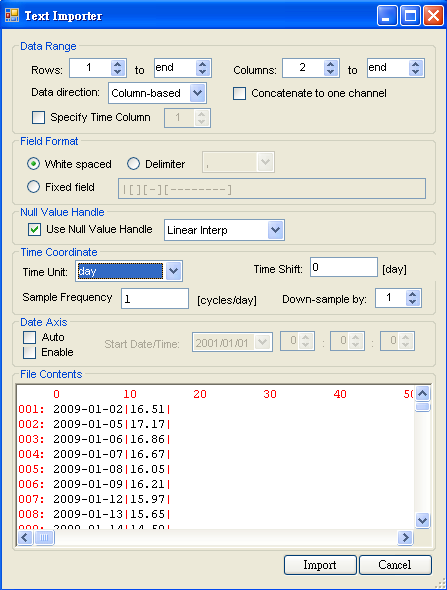 最後要將日期資訊取代現有的時間軸,將 regular 訊號轉成 Indexed 訊號,利用 Text Importer 再開啟 CSV 檔案,Data Range / Specify Time Column 為 Checked,和 Columns: 2 to end,讀取進來訊號屬於 Indexed,時間單位為 day。
