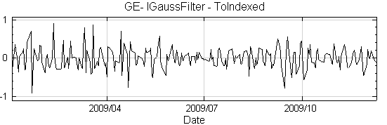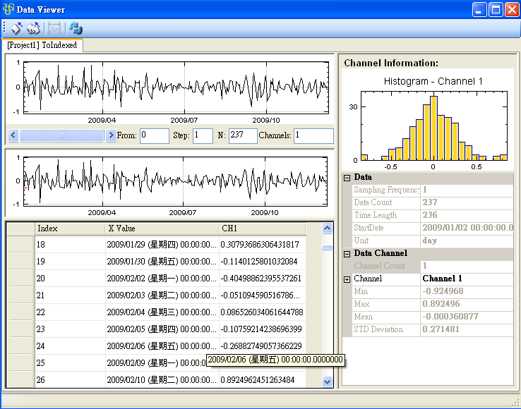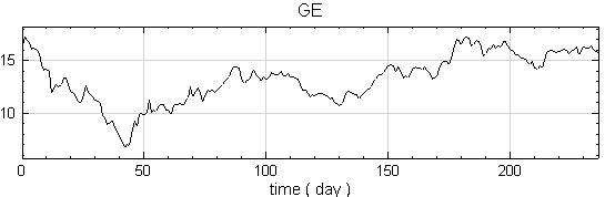 先從 Yahoo Finance : Yahoo Finance Link 下載一筆 GE ( General Electrical Co. ) 2009-01-02 到 2009-12-09 的開盤價,另存 CSV 檔案,由於星期六、日或假期沒有開盤,所以暫且不將日期資料加入,利用 Text Importer 開啟檔案,Data Range / SpecifyTime Column 為 Unchecked 和 Columns: 2 to end,Date Axis/Auto 為 Unchecked,Time Coordinate / Time Unit為 day 以及 Sampling Frequency為 1,讓讀取進來訊號屬於 regular,時間單位為 day。最後連接至 Viewer / Channel Viewer 顯示。