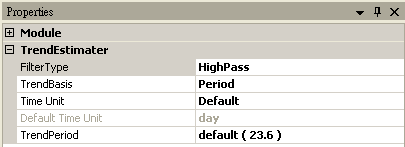 再將 GE Source 連接至 Compute / Filter / Trend Estimator,Trend Estimator 的 Properties 中,Filte Type 為 HighPass,再從 Trend 接至 Viewer /Channel Viewer 顯示。
