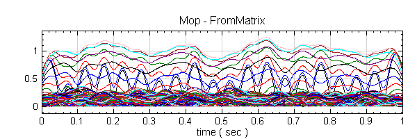 再將兩個轉換為矩陣的資料一起接至 Compute / Matrix / Matrix Operation,參數皆以預設,將 Matrix Operation ( A + B ) 接至 Coversion / Covert from Matrix ,DataType 設定為 TimeFrequencySpectra,最後用 TF Viewer 顯示其結果。