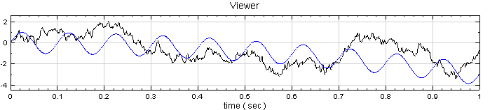 在 Source / Noise 建立一個雜訊 Noise,調整 Properties / NoiseType 為 Brown,接著在 Source / Custom Wave 建立一個 CustomWave,在 Properties / Expression 欄位輸入算式 sin ( 2 * pi * 10* t ) - 3 * pow ( t , 2),最後再將兩組訊號彙集於同一個 Channel Viewer 中,接著執行後會得到如下圖所示的結果。