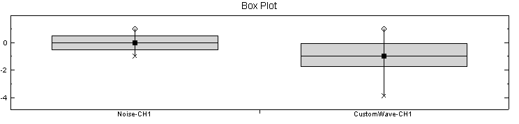 產生一個 Brownian Noise 與 CustomWave,用 Channel Viewer 繪出訊號後,再以 Box Plot Viewer 繪出兩訊號的方盒圖。