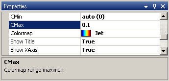 Properties / CMax 為 0.197772704820884,此值為時頻分析結果的顏色最大值,顏色最大值預設是對應資料色彩的最大值。在不同的分析情況,使用者可能對某些頻段的資料較感興趣,這時可藉由調整 CMax 的大小來改變時頻圖的色彩顯示狀況,依不同的狀況調整 CMax 可找到較適的時頻圖,若是想要調整預設CMax,可至 Perference / Plot / Time Frequency Plot 中調整 CMax 。