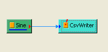 直接輸出 Sine wave 為 csv 檔,首先在 Sine 後方接 Writer / Csv Writer,然後到 Properties 下去修改參數。新增後,必須到 OutputFilename 設定輸出檔案名稱與位置。點選 OutputFilename 欄位右邊按鈕會跳到檔案儲存視窗,以本例來說,將檔名設為 "sine",並儲存在路徑為 C:\ 的位置。