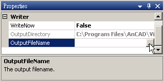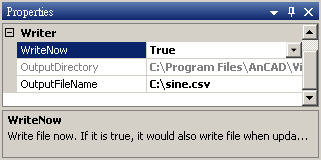 參數為 WriteNow 及 OutputFileName,WriteNow 預設為 False 表示資料並不會即時寫入檔案,True 表示寫入檔案,OutputFileName 決定檔案的位置以及檔名。各參數定義與預設值如下表:
