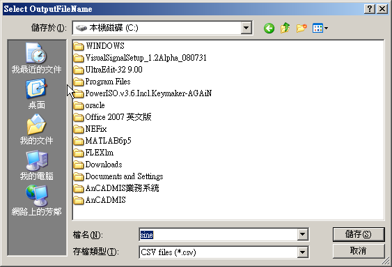 注意因為參數 WriteNow 設定為 False,所以此時檔案尚未儲存,該參數設定為 True 之後,此訊號資料就可以即時的儲存到路徑 C:\ 之中。