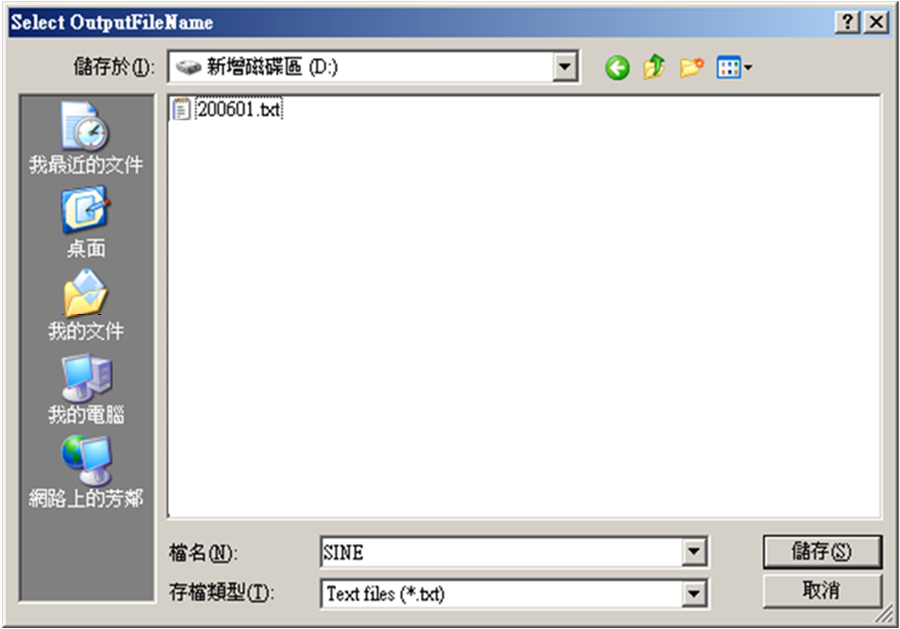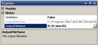 我們將檔名設為" sine ",並儲存在 D:\ 的位置。 須注意因為參數 WriteNow 設定為False,所以此時檔案尚未儲存,該參數設定為 True 之後,此訊號資料就可以即時的儲存到路徑 D:\ 之中。.tfa 檔會將時間軸的資訊以規定的格式儲存在檔案前幾行,因此如果再讀取 .tfa 檔時,無須再次設定如取樣頻率之類的參數。