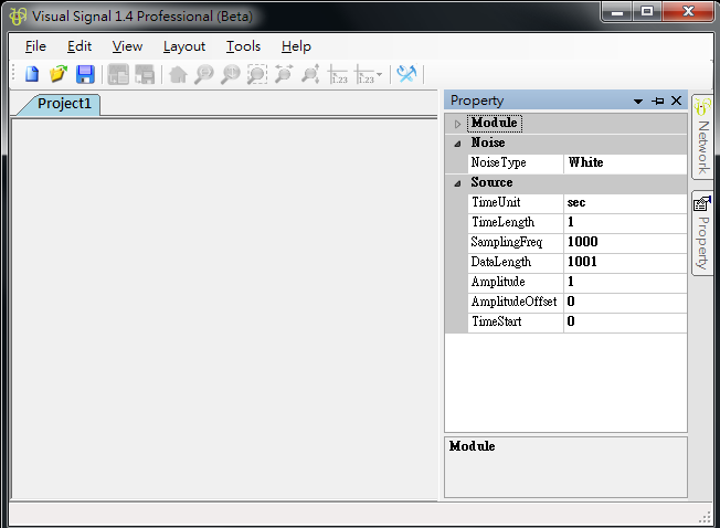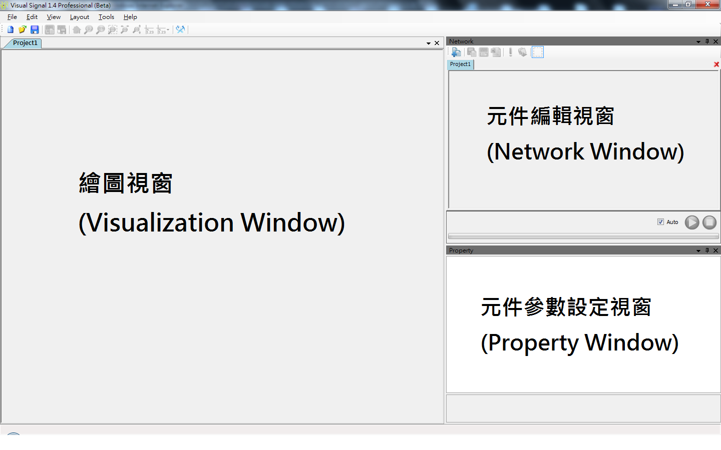 介面主要分成三大部份:元件編輯視窗 ( Network window ),元件參數設定視窗 ( Properties window ) 與繪圖視窗 ( Visualization Window ),這三個視窗皆可以獨立於 Visual Signal 的桌面上。