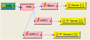 文字左邊的橘色方塊是控制該模組輸入及輸出資料的開關,預設橘色代表打開,若滑鼠再點擊一次則關閉此模組,橘色方塊會變成底色(如下圖之 EMD 元件),此時模組將不會接受資料並進行計算,且也沒有結果輸出,輸出埠後方所連接的模組將無法計算,於此模組後方的連接線也會變成虛線。