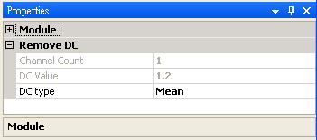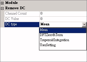 本模組接受實數(real number),單通道(single channel),regular的訊號(signal)、聲音訊號(audio)輸入。參數為DC type,內有四個不同演算法計算訊號在Y軸方向,對y=0的平移量,預設方式是Mean,各計算方式的意義詳列如下表。