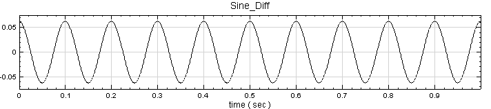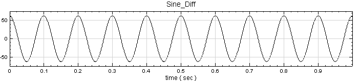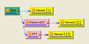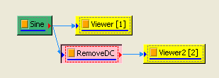 將原本訊號 Sine 接上 Compute / Math / RemoveDC,並設定 DCType 下的方法為 Mean,再將結果以 Viewer / Channel Viewer 顯示結果,可發現平移量被消除了。