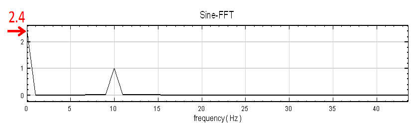 可將訊號接上 Compute / Transform / Fourier Transform 做傅立葉轉換。關掉 FourierTransform 下的 Remove DC,可發現在時間原點的值確實為1.2之2倍。