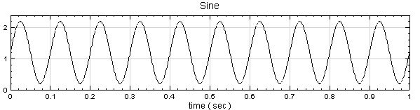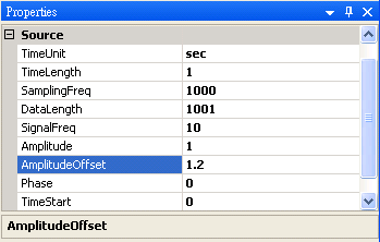 以 Source / Sine Wave 建立正弦波,調整 Properties/ Source / AmplitudeOffset 為1.2,可將訊號對 Y 軸往正方向平移 1.2,再以 Viewer / Channel View 觀察。