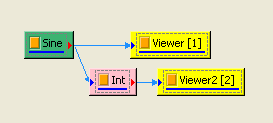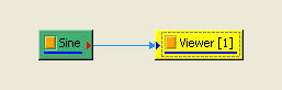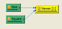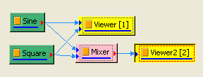 將此兩訊號相加輸出成一個新的訊號。以 Compute / Math / Mixer 混合,如下圖 Network 所示,Mixer 的第一個 Input 為 Sine,對應 Mixer 的參數 Gain1,第二個 Input 為 Square,對應參數 Gain2,參數預設值皆為 1。再來以 Viewer / Channel Viewer 繪出 Mixer 之波形,其結果如下。