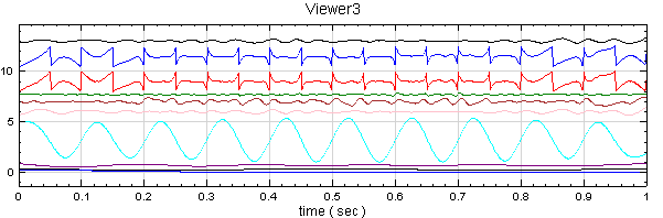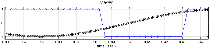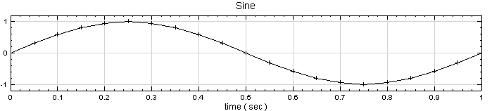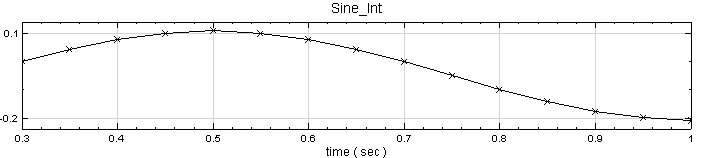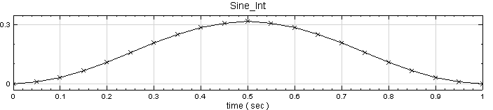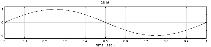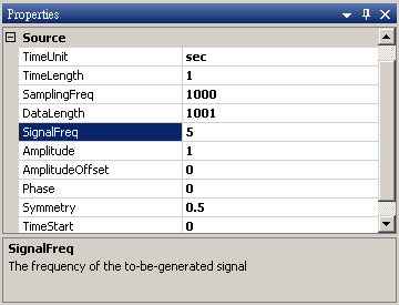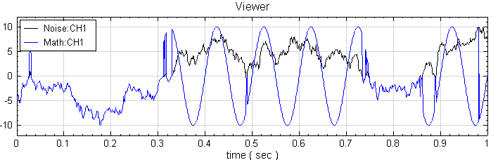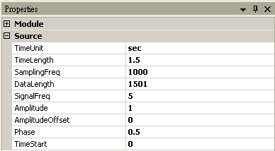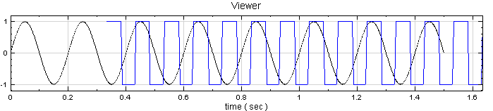 以 Source / SineWave 產生一訊號頻率為5、取樣頻率為 1000Hz、時間長度為 1.5 秒的正弦波;另外再產生一訊號頻率為 10、取樣頻率為 300Hz、時間長度為 1.3 秒,時間起始點為 0.333 秒的方波。然後以 Viewer /Channel Viewer 先觀察波形。