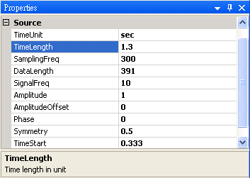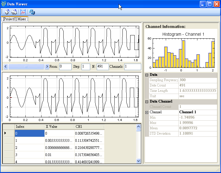 現在用 Data Viewer 檢視 Mixer 輸出訊號的取樣頻率與訊號時間,Mixer 輸出訊號的取樣頻率(Sampling Frequency) 為 300Hz,訊號時間由 0 秒開始到 1.63333 秒結束。Mixer 的計算方法就是以合併輸入訊號的時間軸作為時間總長度,取樣頻率採取輸入訊號中的最小值,將各輸入訊號乘以對應的加權數累加。因此在使用 Mixer 時對於輸入訊號與輸出訊號的取樣頻率需加以留意。