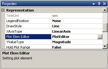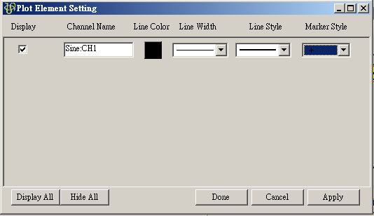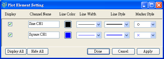 設定 Channel Viewer 的 Properties / PlotEditor,將 Sine 的線條加上符號 ' o ',Square 線條加上符號 ' x ',並使用 Zoom X 工具放大兩訊號時間重疊處,可以看到訊號資料點在 X 軸方向上的分佈完全不同。PlotEditor 的設定如下。