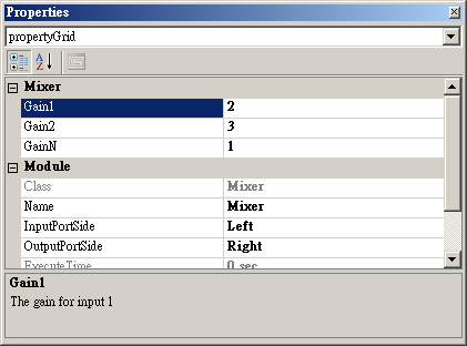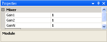 參數 Gain1、Gain2、GainN 分別為第一、第二及第三筆之後輸入訊號的增益數。此模組與 Math 的差異在於,Mixer 可較快速的處理加減運算,而且可對於訊號長度不同的訊號做加減運算,這一點是 Math 沒有支援。