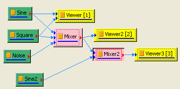 注意三筆以上資料依然可以混合,但第三筆以後的加權數皆設定為 GainN,故單一 Mixer 不建議連結三筆以上的資料。建議使用多層 Mixer 以實現三筆以上資料相加,下圖就是利用這個方式累加多筆訊號。