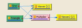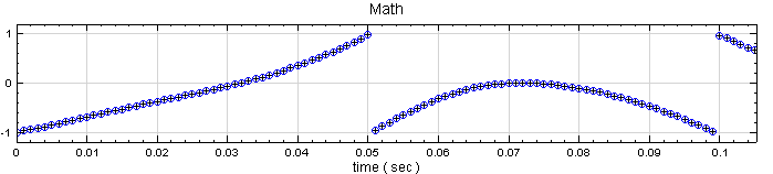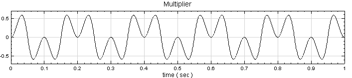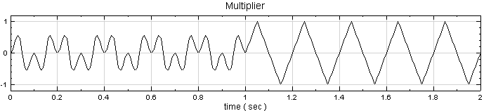 如同 Mixer,multiplier 允許兩訊號的取樣頻率與時間長度(TimeLength) 不相同,輸出訊號之取樣頻率為輸入訊號最小的取樣頻率,僅在輸入訊號時間軸交集的部份相乘,沒交集的訊號則維持原貌。調整三角波的 SignalFreq 為 100,TimeLength 為 2,則運算結果的 Signal Frequency 將會等於 100,Time length 為等於 2秒。