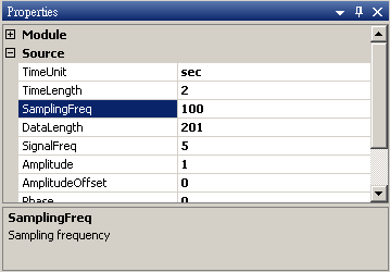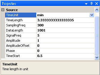 這裡將示範參數 ReferenceInput 的意義。回到程式的 Network,點選 Sine,將 Properties / Time Unit 設為 min (分鐘),SamplingFreq 調為 300,TimeStart調為 0.5。