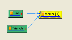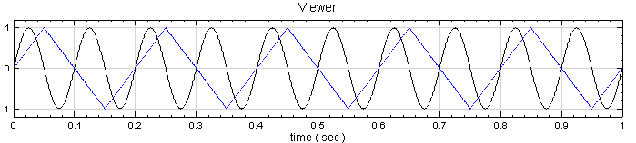 以 Source / Sine Wave、Triangle Wave 建立正弦波與三角波,三角波的 Properties / SignalFreq 調整為 5,以 Viewer / Channel Viewer 觀察其原本波形。