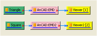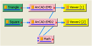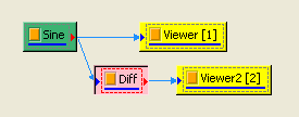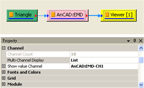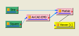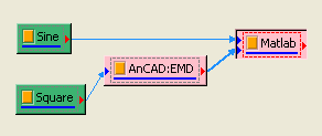先以 Source / SineWave 與 Square Wave 產生兩組訊號,其中 Square Wave 後連接 Compute / HHT / EMD 產生一組多通道 ( multi-channel ) 訊號,Sine 與 EMD 都連接至DoMatlab。
