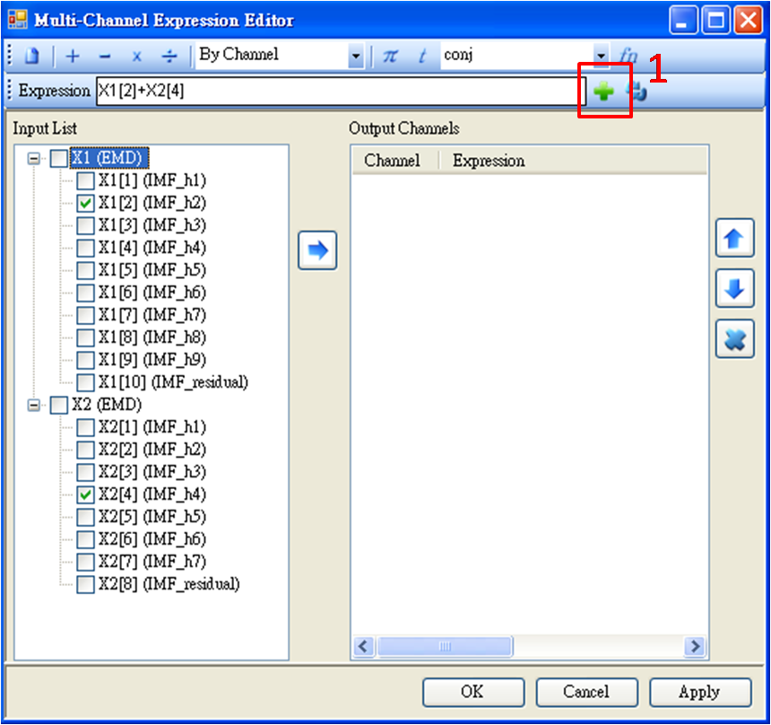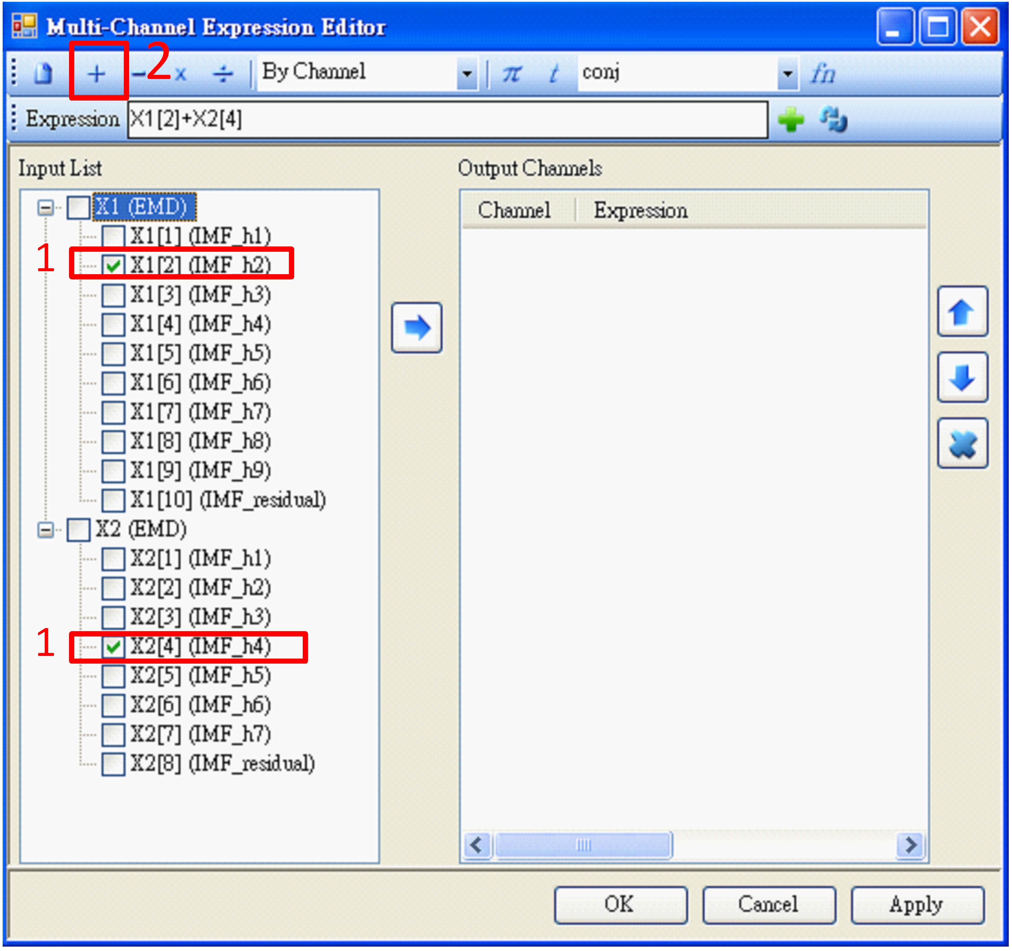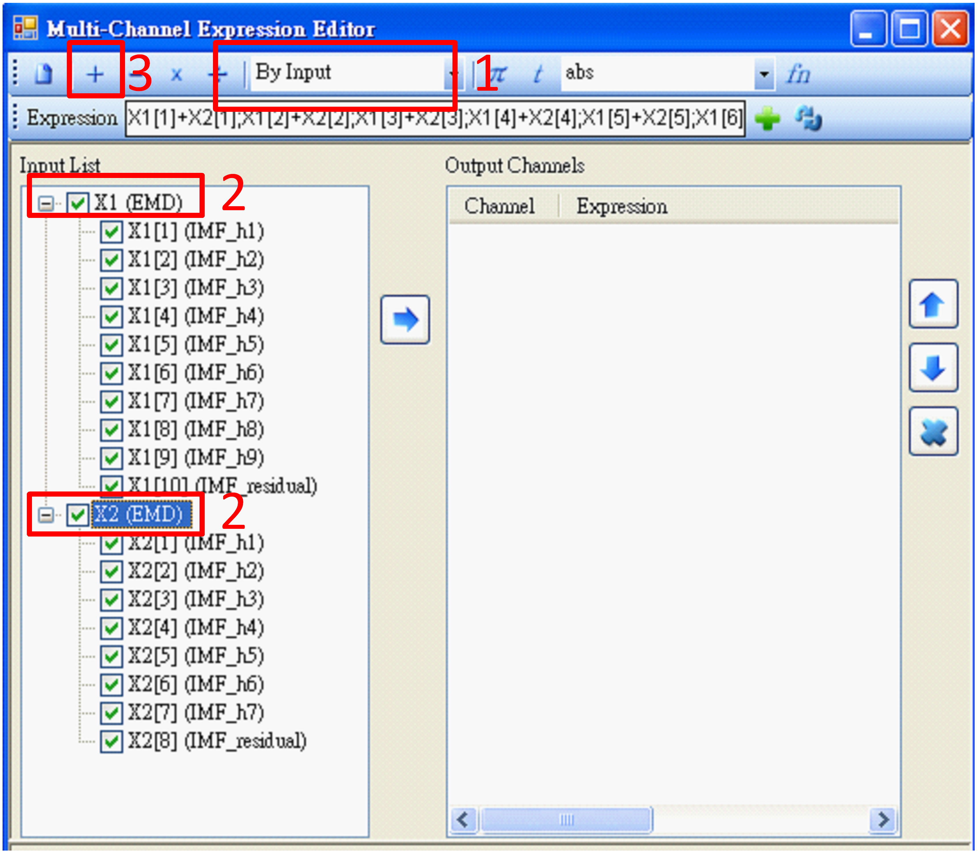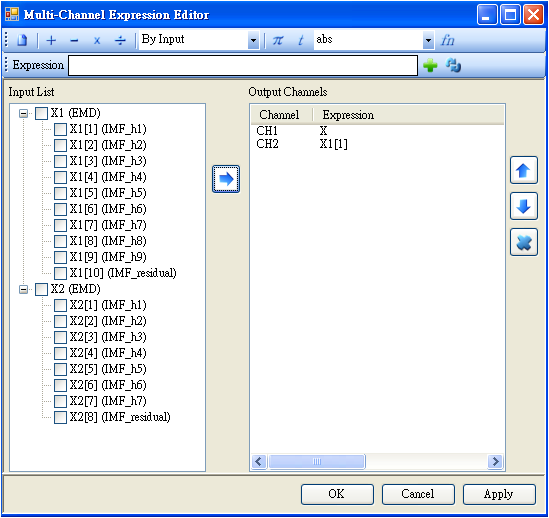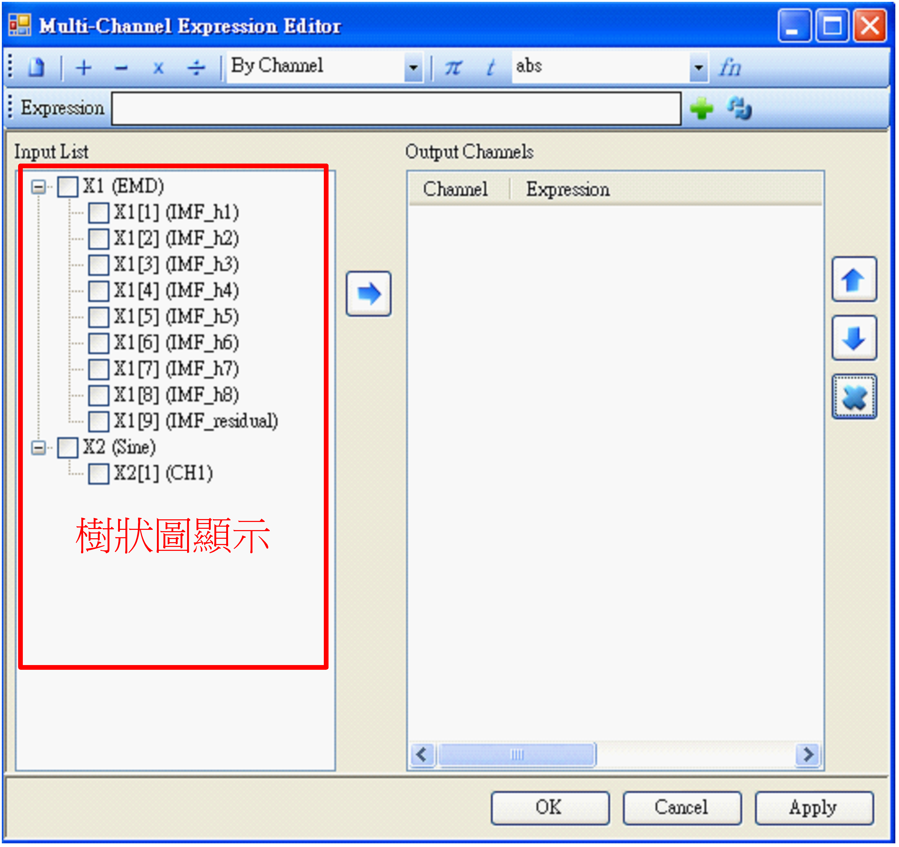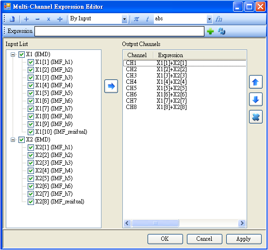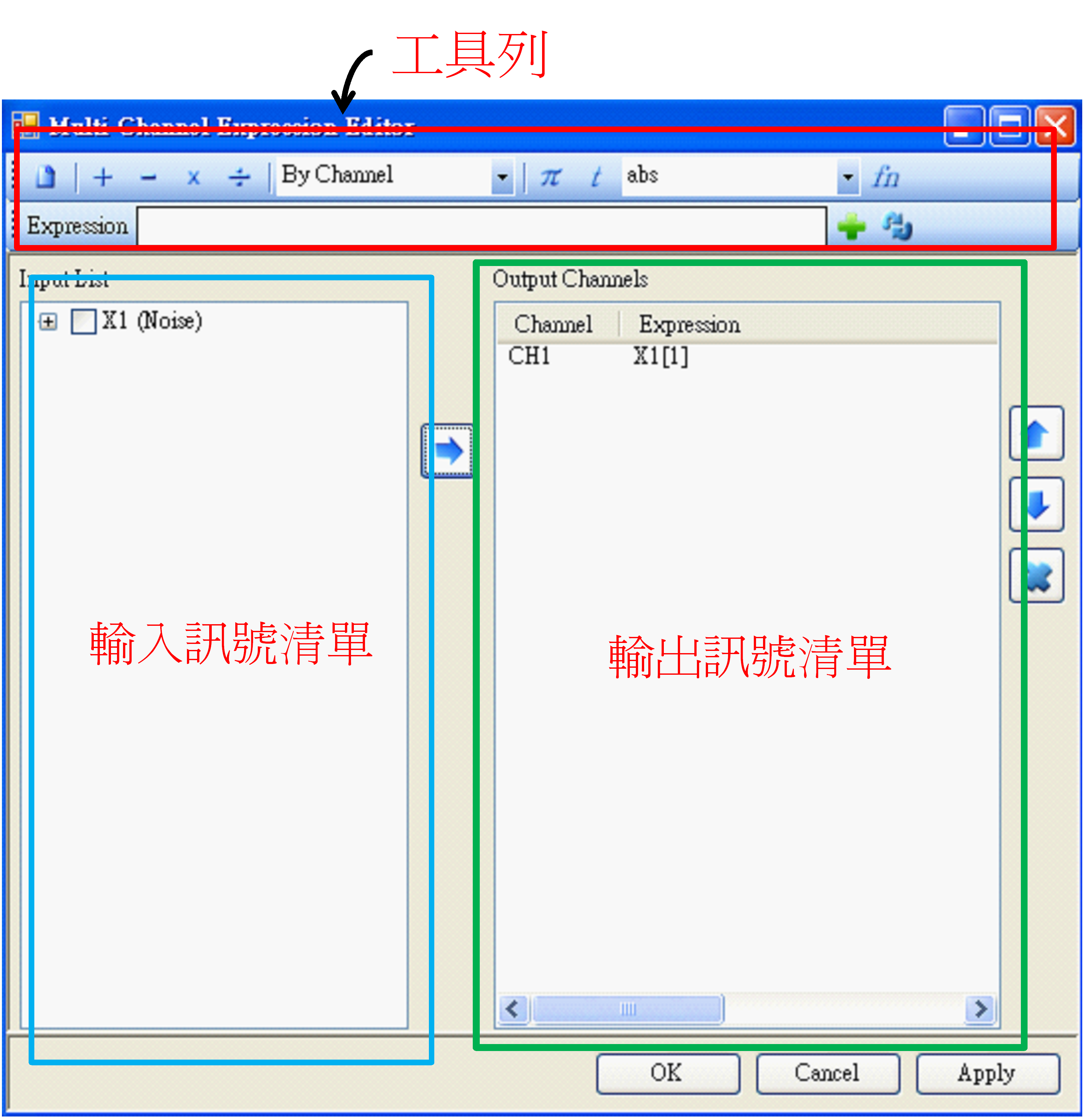 此視窗分作三大部份:輸入訊號清單(Input List)、工具列以及輸出通道欄(Output Channel)。運作流程如下:由輸入訊號清單中選擇訊號,於工具列中的 Expression 欄輸入數學運算式;完成後將算式新增到輸出欄作為輸出訊號其中一個通道。以下就說明各功能。