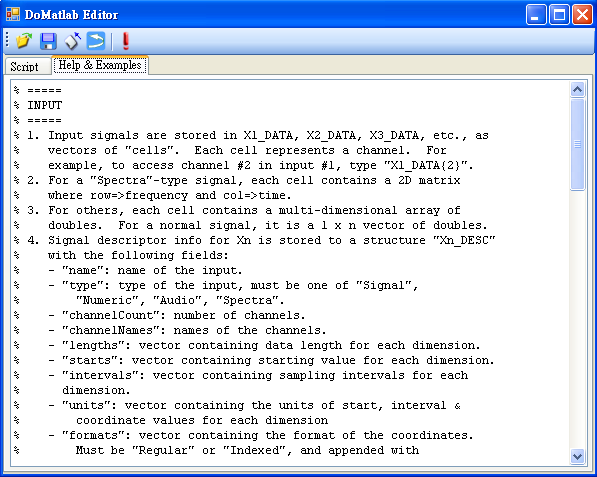 注意DoMatlab 的參數 ReferenceInput 與其它元件(Merge to Multi-Channel、Merge to Complex、Math)的 ReferenceInput 在運作上略有不同,此參數在 DoMatlab 是作為預設輸出訊號的時間軸座標;在其它元件則會直接將所有輸入訊號的時間軸座標值替換為 ReferenceInput 設定的訊號時間軸座標值。