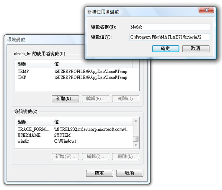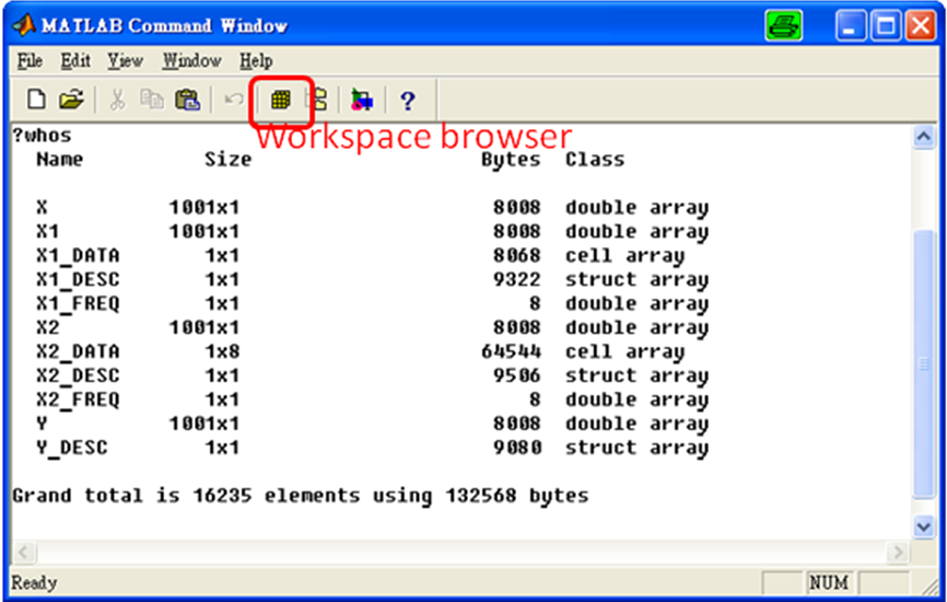 產生 DoMatlab 元件後會自動跳出 Matlab Command Window,先在 MatlabCommand Window 中鍵入 ' whos ',或按下該視窗工具列上的 Workspace browser 查看目前 Matlab 的變數有那些。