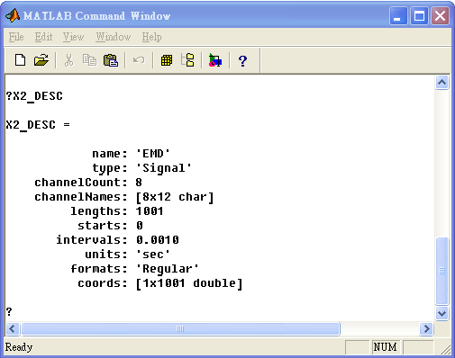若需要查詢輸入訊號之基本資料。譬如在 Command Window 中鍵入 X2_DESC,按下 Enter,就能得到輸入訊號 X2 的資料。