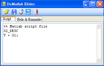 步驟 3 的查詢也可利用 DoMatlab 的參數 DumpOutput 達成。先將DoMatlab Editor 之內容改為 X2_DESC,並保留 Y = X1; 以定義輸出訊號(如下圖)。