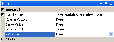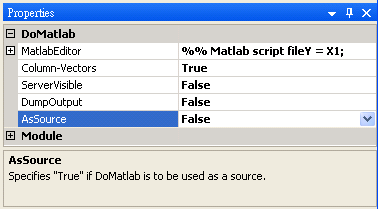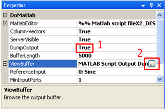 Properties / Viewbuffer 可觀看 DumpOutput 的記錄,這樣在執行 DoMatlab 時若出現錯誤 ,仍然能得到 Matlab 產生的錯誤訊息。