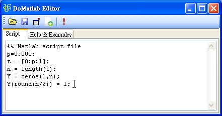 建立變數 p = 0.001 作為取樣週期,變數 t 是各訊號資料點對應的時間,變數 n 是訊號長度,變數 Y 就是輸出訊號,所有資料點的值先設為 0,並在訊號長度約一半的位置將值設為 1,這樣輸出訊號 Y 的數值部份已經創造完成。接下來需設定訊號的時間軸定義變數 Y_DESC,程式碼如下: