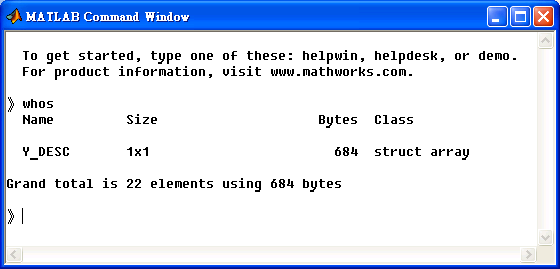 在 Matlab Command Window 中鍵入" whos " 查詢變數的結果如下圖,因為沒有輸入資料,變數僅有 Y_DESC,因此需先創造輸出變數 Y,再將資料格式之設定填入變數 Y_DESC 內。