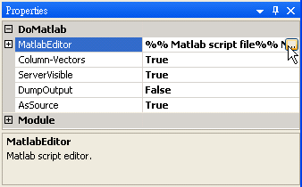 接下來以 Properties / MatlabEditor 產生訊號。藉由設定Y_DESC,基本上 DoMatlab 可以產生所有格式的資料。本步驟示範產生一個 impulse signal。新開一個 Project 並重覆步驟 1 產生 DoMatlab source, 然後由 Properties / MatlabEditor 進入編輯頁面。