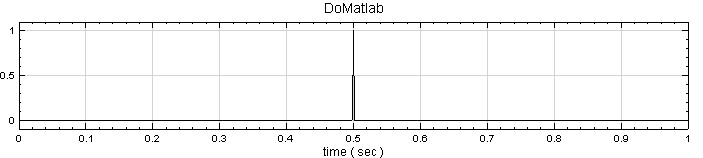 DoMatlab 為方便使用者操作,已預設輸出訊號的 type 為 Signal、開始時間 starts 為 0、時間單位 units 為 sec、離散格式 formats 為 regular 等參數,因此預設的參數值就是上圖被 comment 的部分,使用者僅需設定取樣週期 Y_DESC.intervals,就可以把 Y 輸出。現在關閉 Matlab Editor 回到 Network,在 DoMatlab 後面接上 Channel Viewer 可以看到產生了一組 Impulse 訊號。