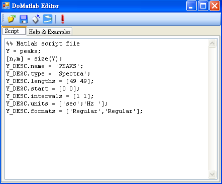 本步驟利用 Matlab 內建的函式 peaks產生大小為 49 x 49 的矩陣,並將其訊號格式設為時頻分析資料 (Spectra) 輸出。新開一個 Project,按照步驟 2 產生 DoMatlab 訊號源,並打開 Properties / MatlabEditor。先產生一個 peaks 作為輸出訊號 Y。