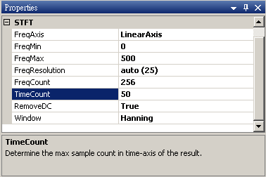 若是改變STFT 的參數 TimeCoant 或FreqCount,則STFT 會根據新設定的網格數量重新計算,因此會影響計算結果的解析度以及運算時間。現在改變 TimeCount 為 50,則運算速度變快,但結果的解析度亦變差。