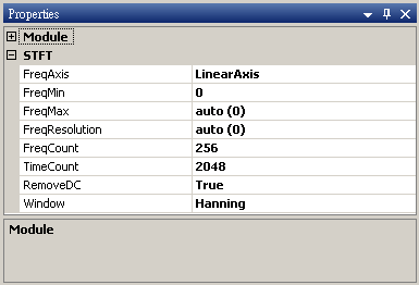 本模組接受實數(real number),單通道(single channel),regular的訊號(signal)、聲音訊號(audio)輸入;輸出訊號格式為實數,單通道,regular的時頻(spectra)資料。參數須設定起始與終點位置,其單位等於輸入訊號的時間單位。