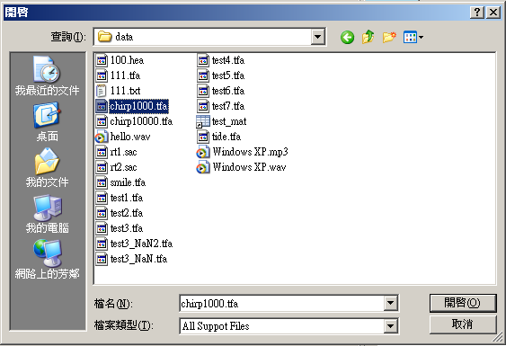 datafrom file 讀取訊號檔,檔案 chirp1000.tfa 位在安裝目錄下data資料夾 ( 預設為 C : \
