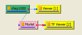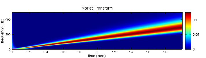 以 Compute / TFA / Morlet Transform 對輸入訊號作計算,再以 TFA Viewer 繪出,可明顯看到在越高頻的地方,頻率散佈範圍越大,轉換的效果越差。