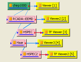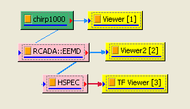 在 Chirp_1000後接上 Compute / HHT / RADAC EEMD計算出 IMF (Intrinsic mode function),再以 Viewer / Channel viewer 繪出。