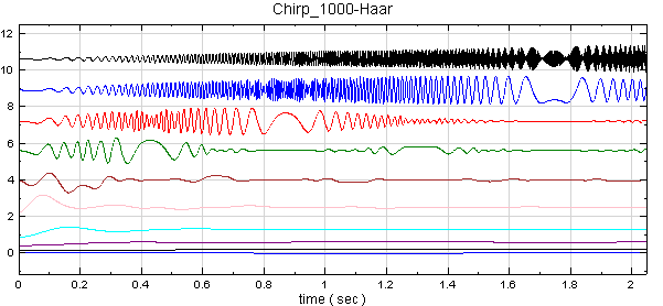 Hilbert Spectrum 也可由 Haar Wavelet Transform 計算瞬時頻率。在 Chirp_1000 後方接上 Compute / Transform / Haar Wavelet Transform,再把 Properties / FilterBank levels 調為 9,Resampling method選 Spline,最後仿照步驟 2~3 進行時頻計算。